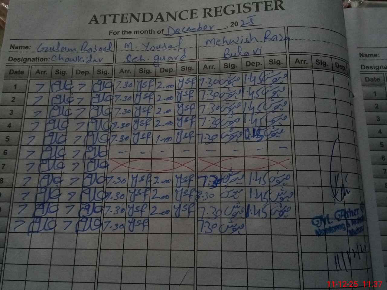 | CNIC | Full Name | Designation | R/C | Absence during last cal. month |