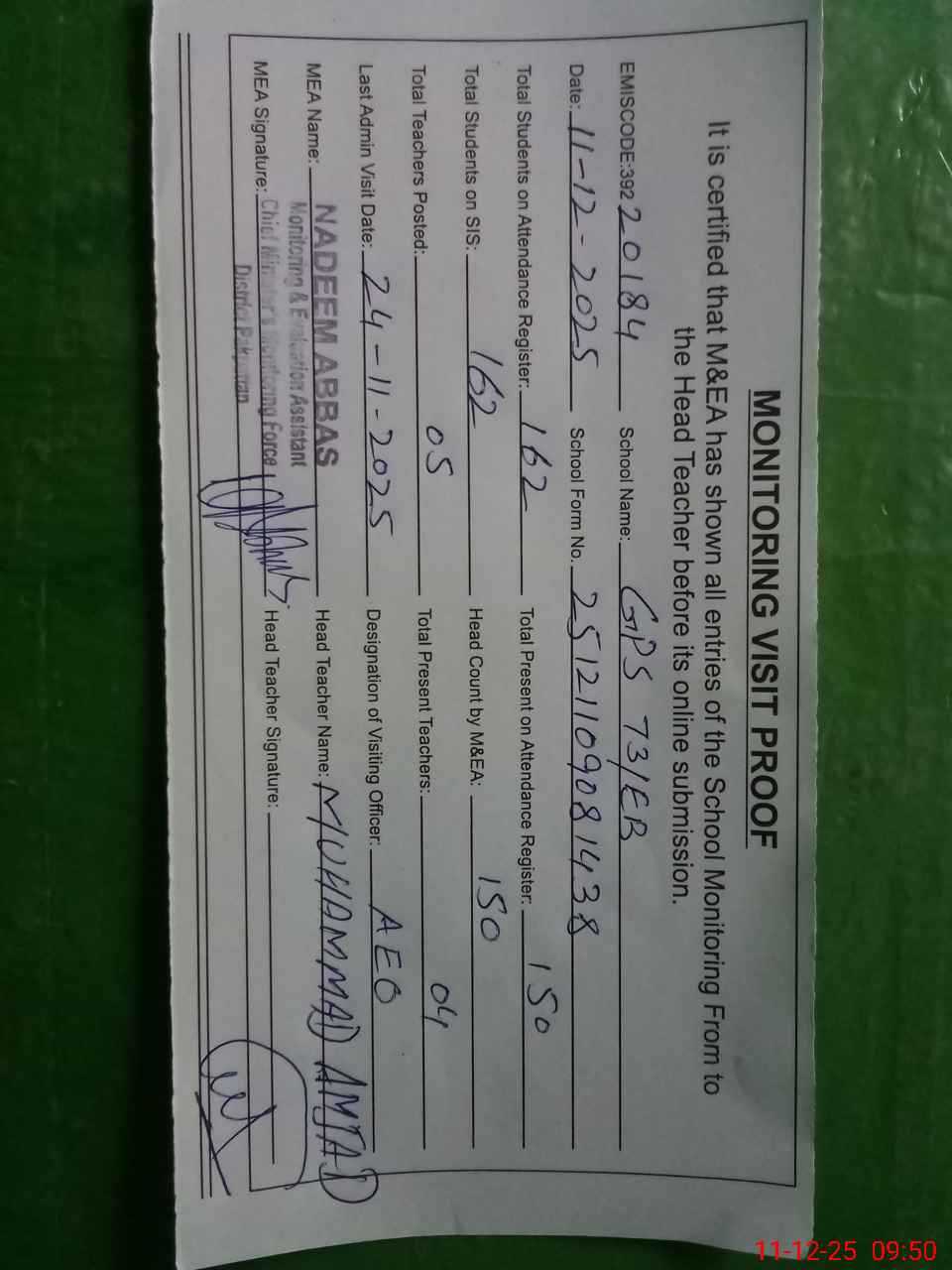 | Attendance Register | Head Teacher | MEA with School | Visit Proof |