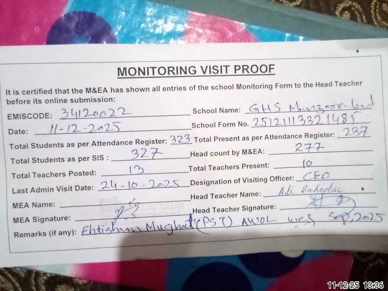 | Attendance Register | Head Teacher | MEA with School | Visit Proof |