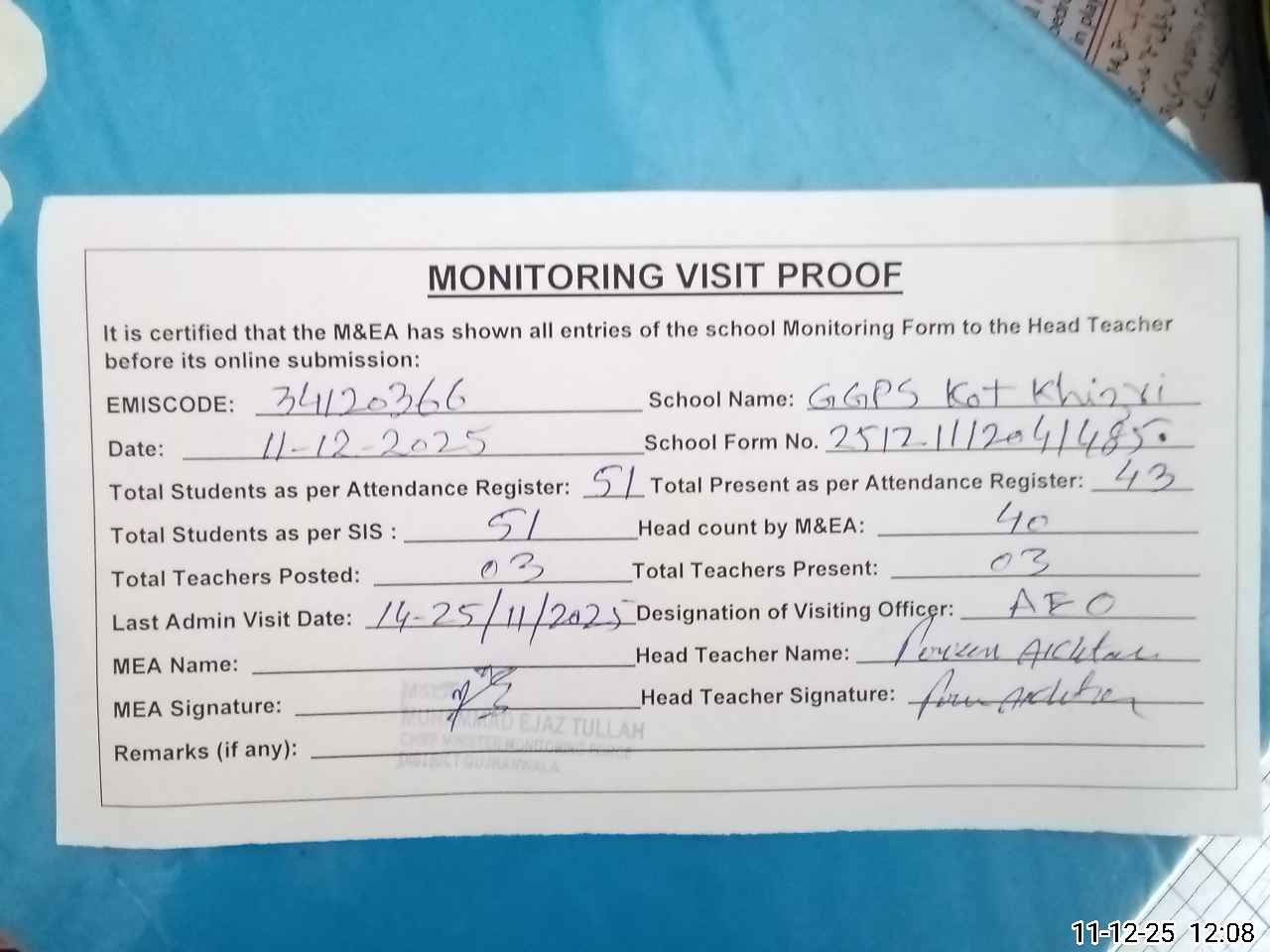 | Attendance Register | Head Teacher | MEA with School | Visit Proof |