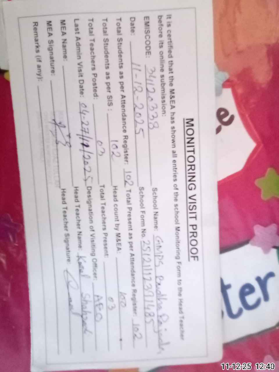| Attendance Register | Head Teacher | MEA with School | Visit Proof |