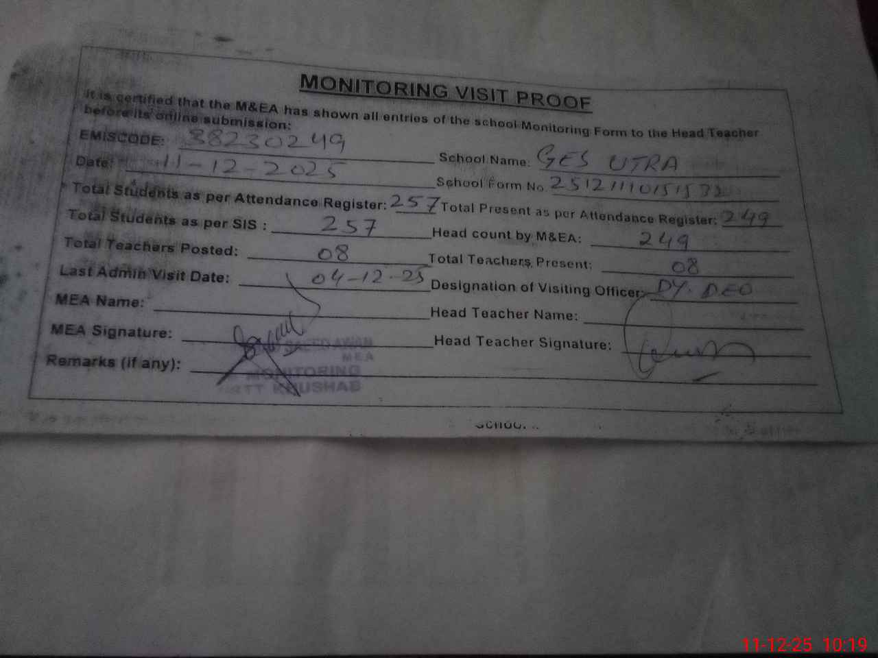 | Remarks (Use Separate Page if Required): Students on SIS QTY 257 Last admin visit On 04 December 2025 by Dy DEO | |||||