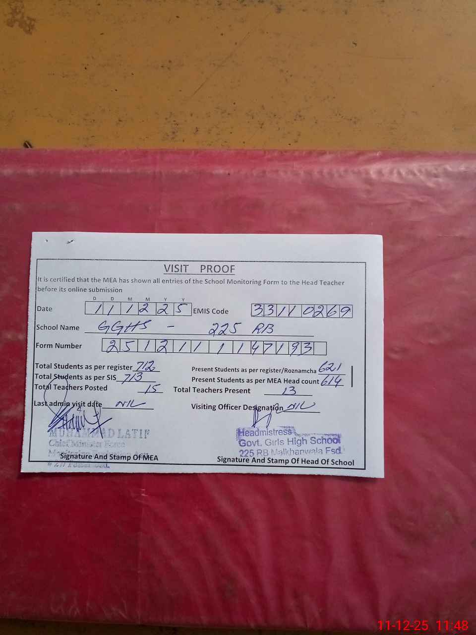 | Attendance Register | Head Teacher | MEA with School | Visit Proof |