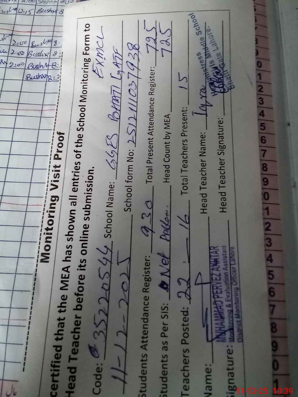 | Monitoring Date: 11-12-2025 | Start Time: 11-12-2025 09:31 AM | End Time: 11-12-2025 10:40 AM | Name of MEA: M.**** AK**** | |