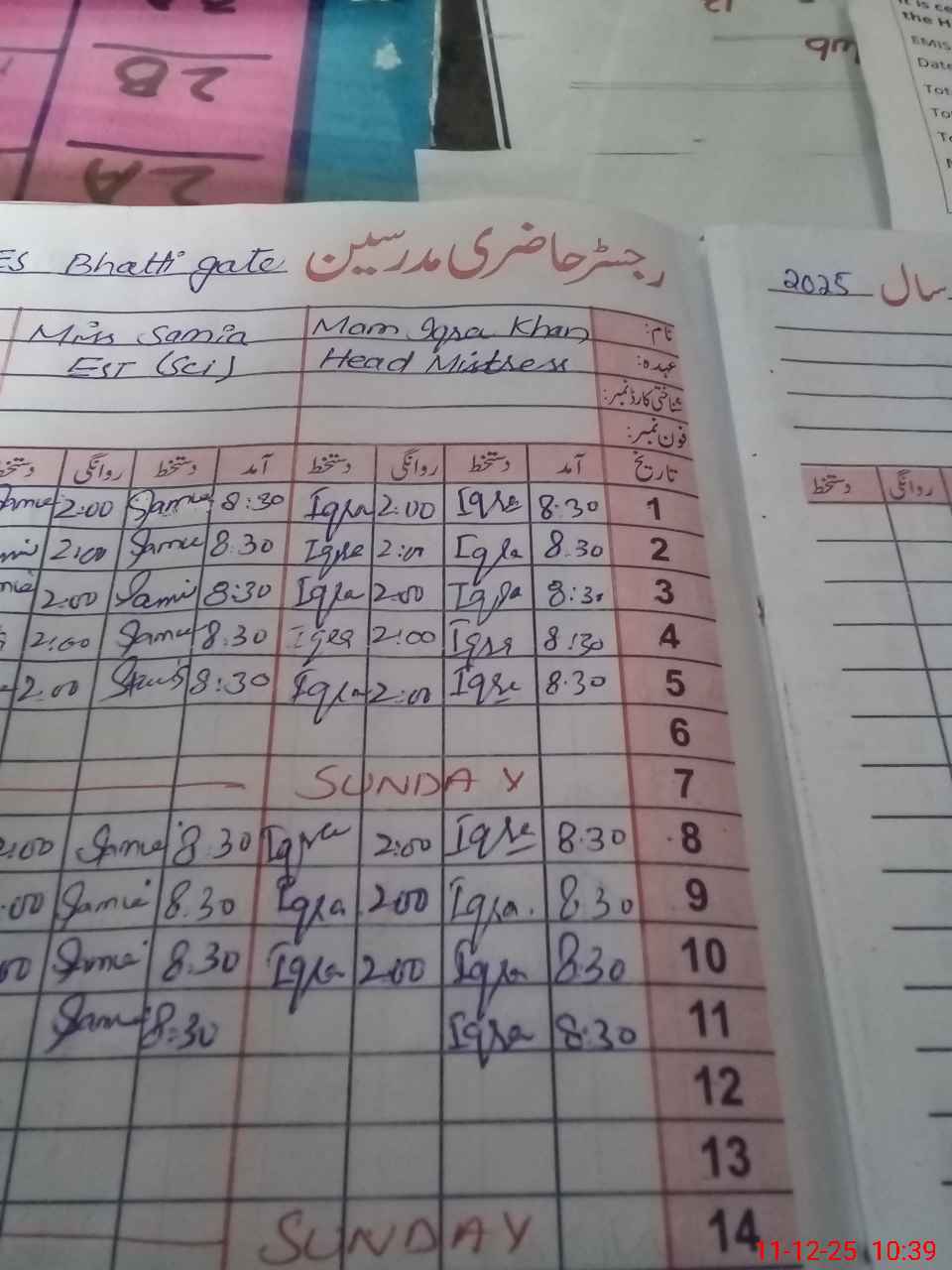 | Total no. of Classrooms: 16 No. of Classrooms Used for Teaching: 15 No. of Classrooms Storing Old Furniture, FTBs, etc: 0Comments if Any: Chowkeedar Aziz Khan from 24 November 2025 Absent PST Atifa long Absent from since 3 February 2025 Absent |