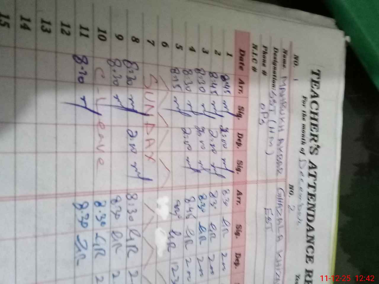 | CNIC | Full Name | Designation | R/C | Absence During Last Calender Month |