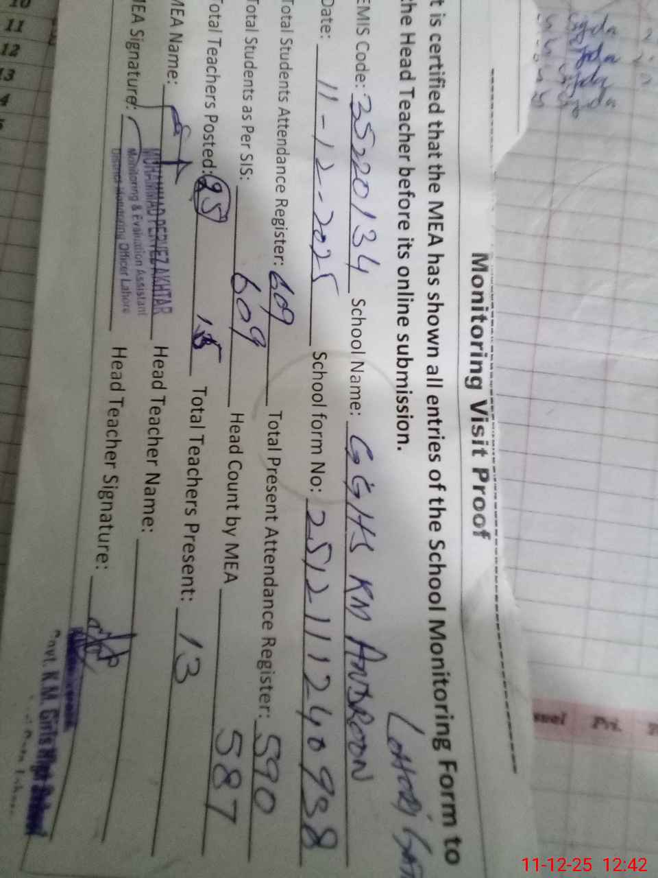 | Attendance Register | Head Teacher | MEA with School | Visit Proof |