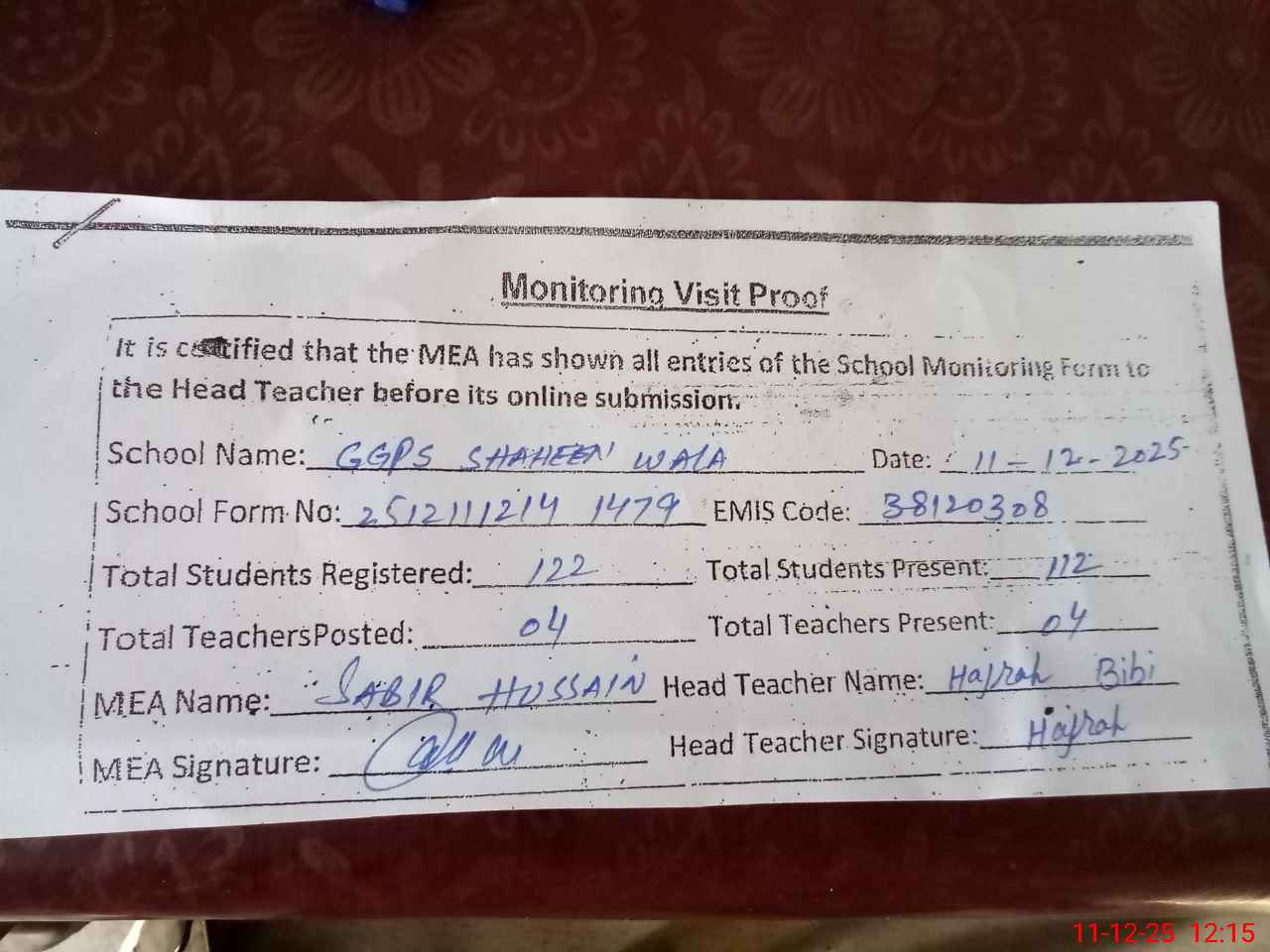 | Remarks (Use Separate Page if Required): last visit by AEO ZAHRA SAFDAR on 08 12 2025 | |||||