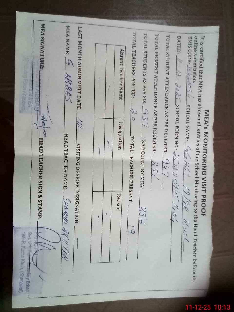 | Attendance Register | Head Teacher | MEA with School | Visit Proof |