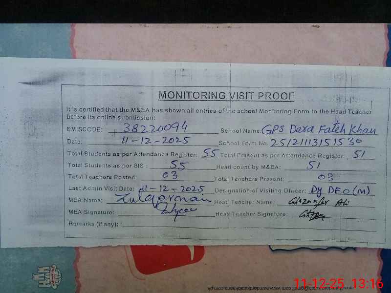 | EMIS Code: 38220094 | Name of School: GPS DERA FATEH KHAN | |||