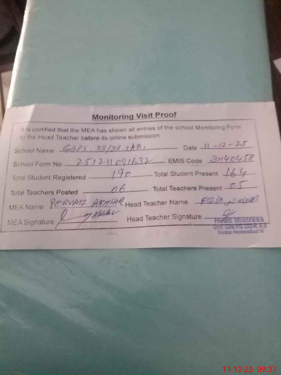 | Attendance Register | Head Teacher | MEA with School | Visit Proof |