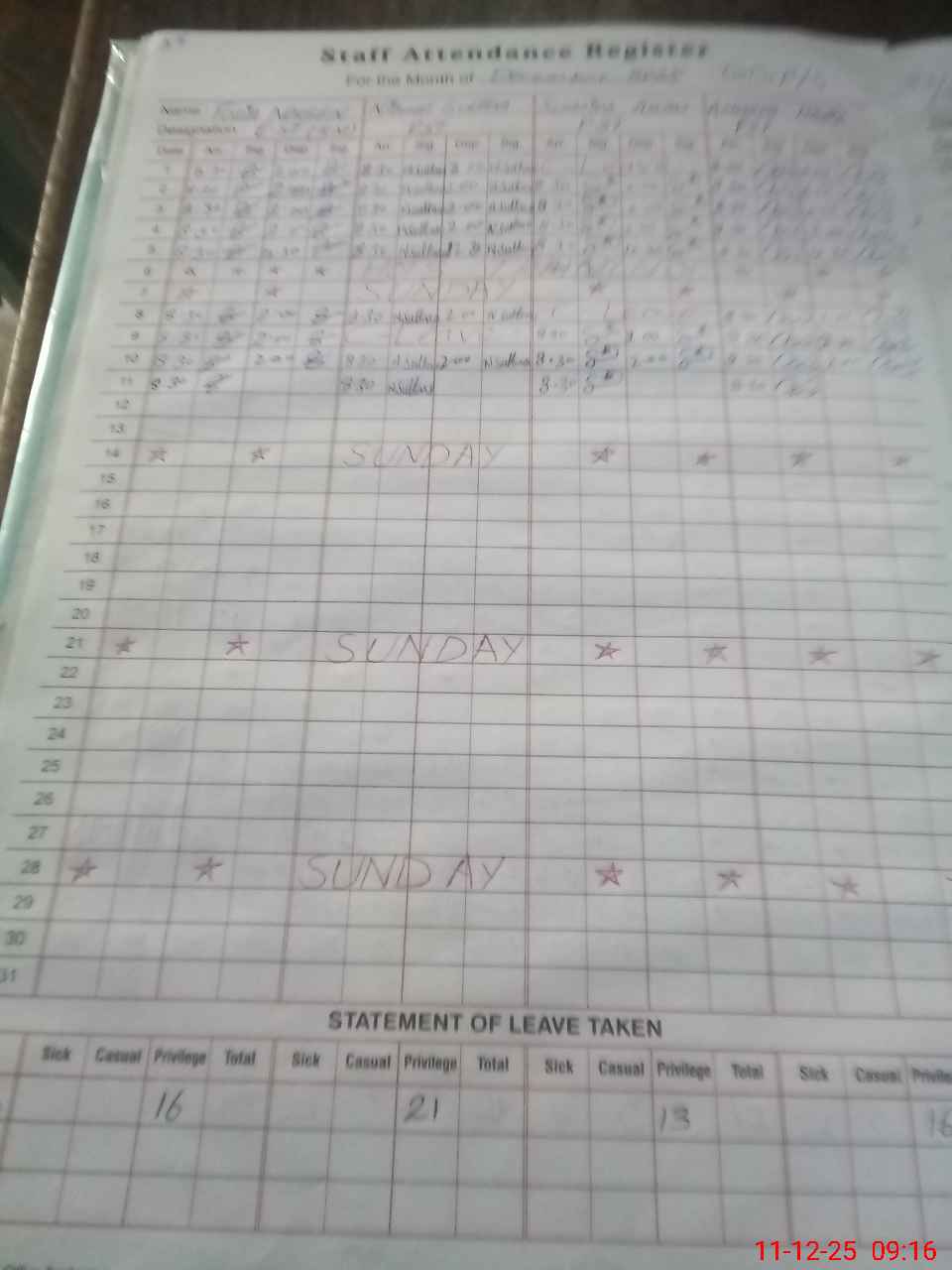 | CNIC | Full Name | Designation | R/C | Absence During Last Calender Month |