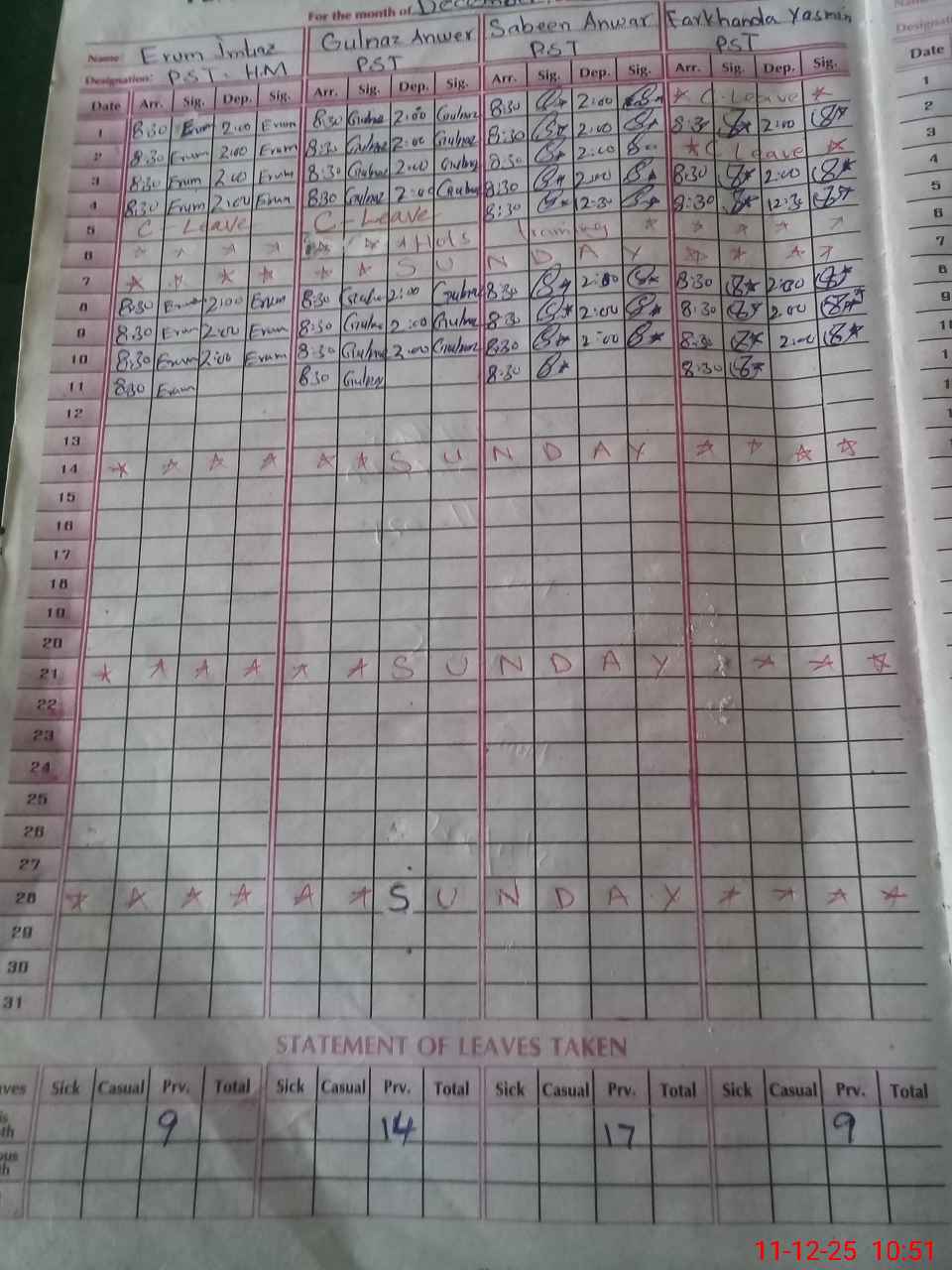| CNIC | Full Name | Designation | R/C | Absence During Last Calender Month |
