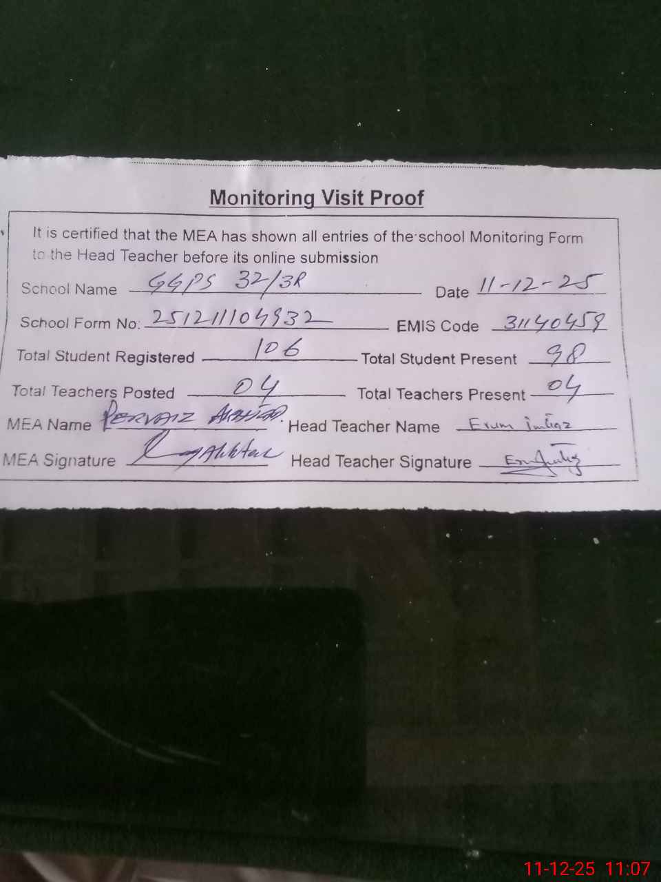 | Attendance Register | Head Teacher | MEA with School | Visit Proof |