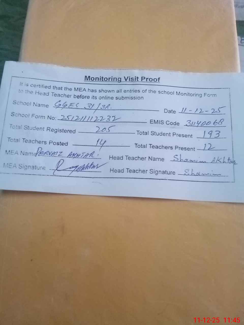 | Attendance Register | Head Teacher | MEA with School | Visit Proof |