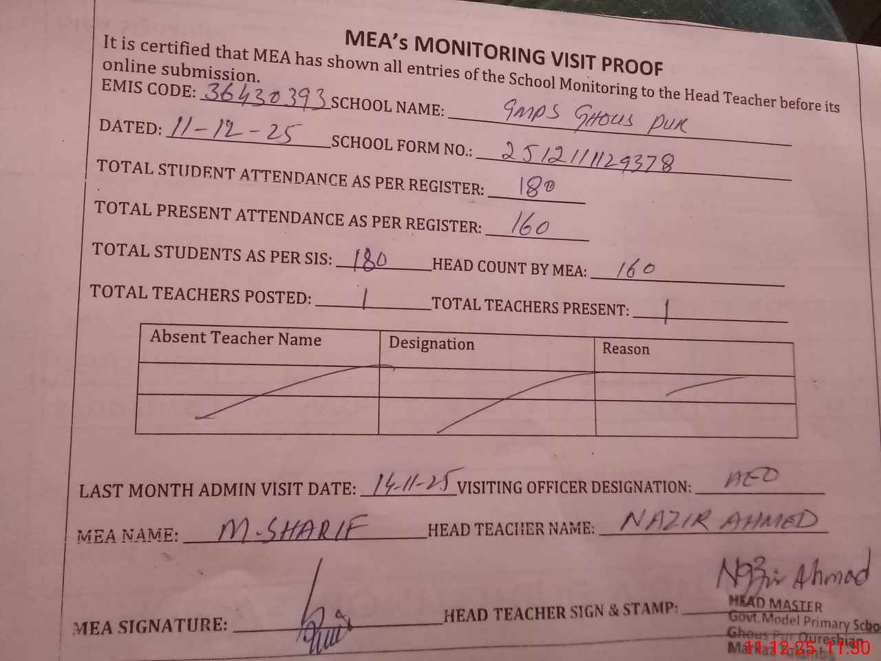 | Attendance Register | Head Teacher | MEA with School | Visit Proof |