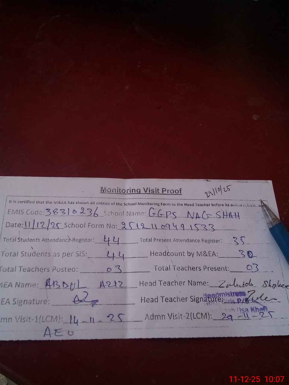 | Attendance Register | Head Teacher | MEA with School | Visit Proof |