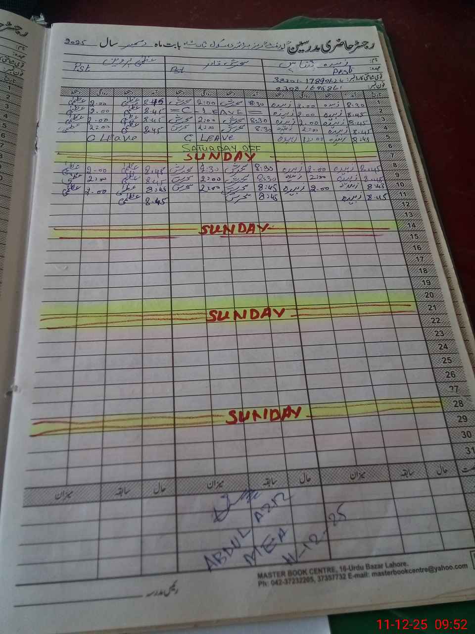 | CNIC | Full Name | Designation | R/C | Absence During Last Calender Month |