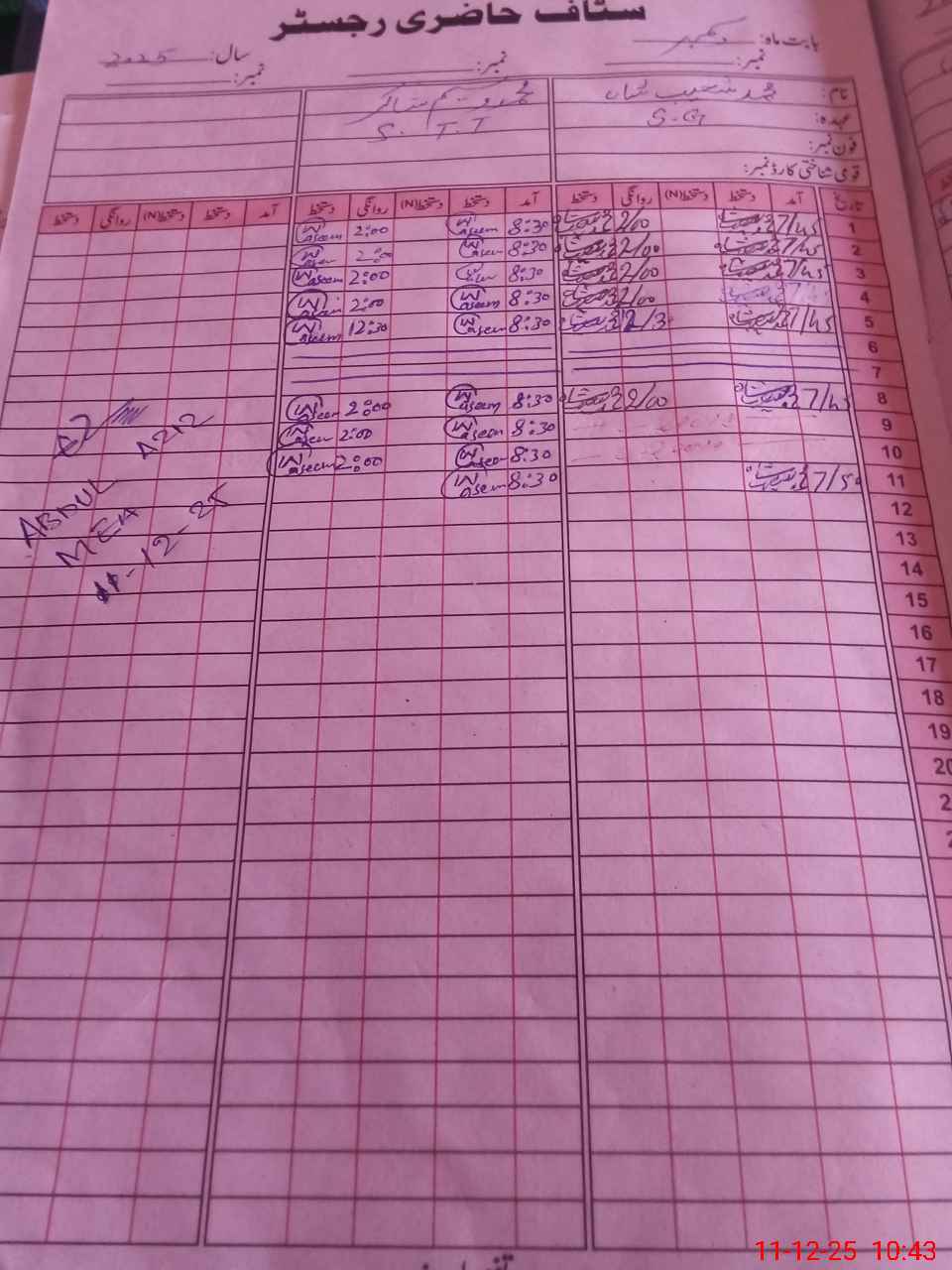 | CNIC | Full Name | Designation | R/C | Absence During Last Calender Month |