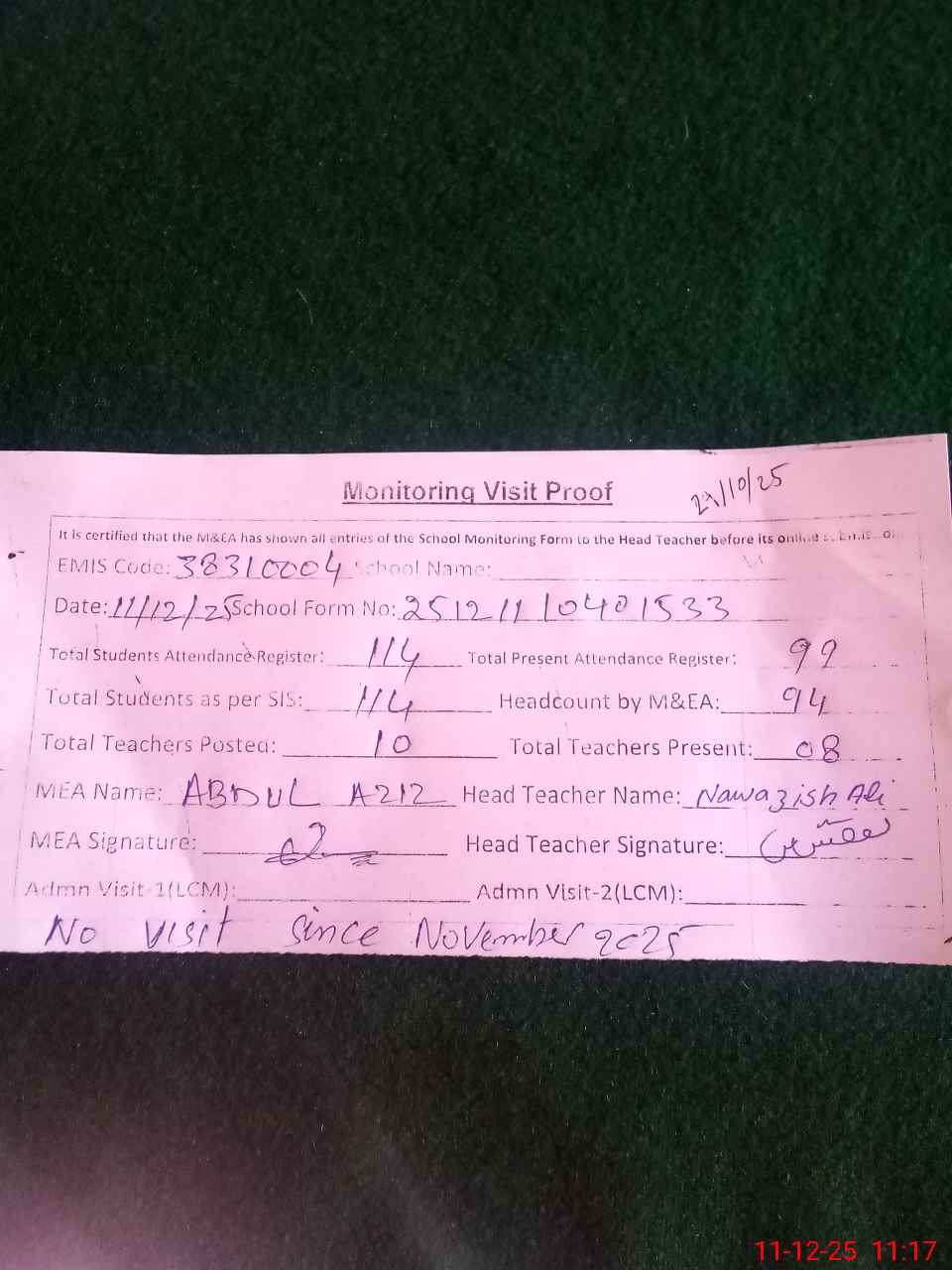 | Attendance Register | Head Teacher | MEA with School | Visit Proof |