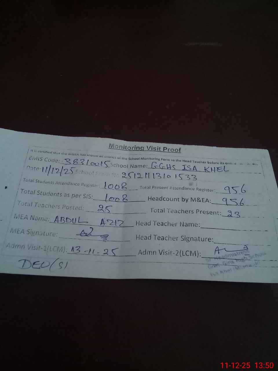| Attendance Register | Head Teacher | MEA with School | Visit Proof |