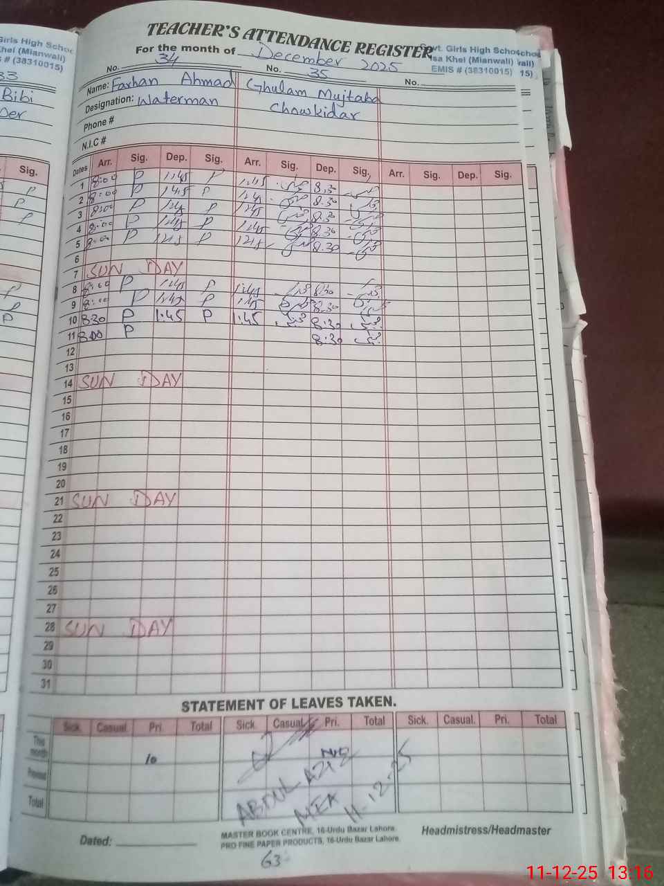 | 38**** | Ni**** Ma**** | SCHOOL GAURD | Regular | 0 | 0 | 0 | 0 | 0 | 0 | 0 | 0 | 0 | Casual |