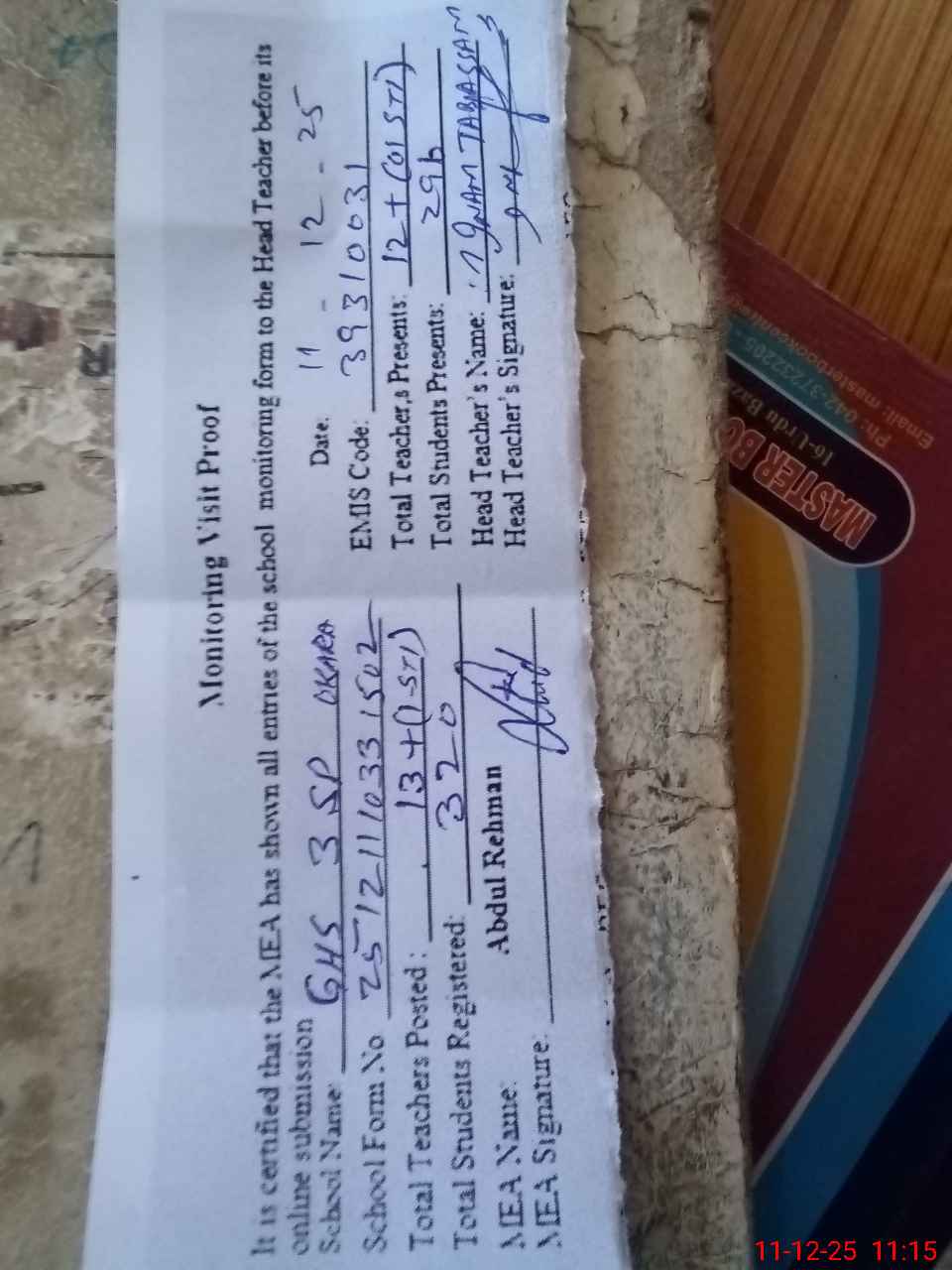 | EMIS Code: 39310031 | Name of School: GHS CHAK NO. 3/SP OKARA | |||