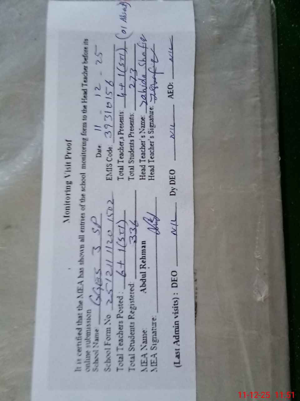 | EMIS Code: 39310156 | Name of School: GGES CHAK 3/S.P | |||