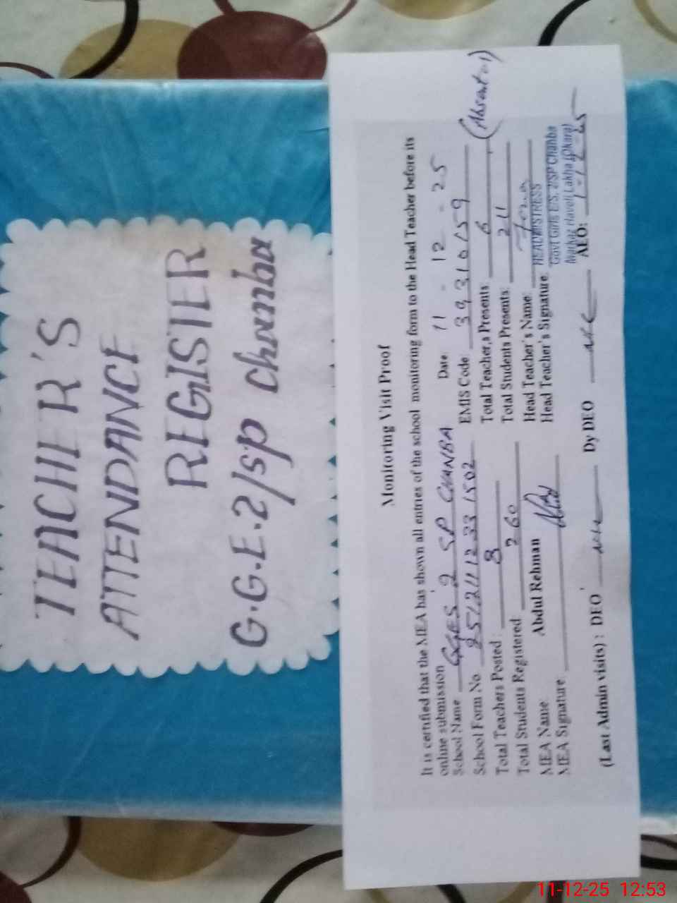 | Attendance Register | Head Teacher | MEA with School | Visit Proof |
