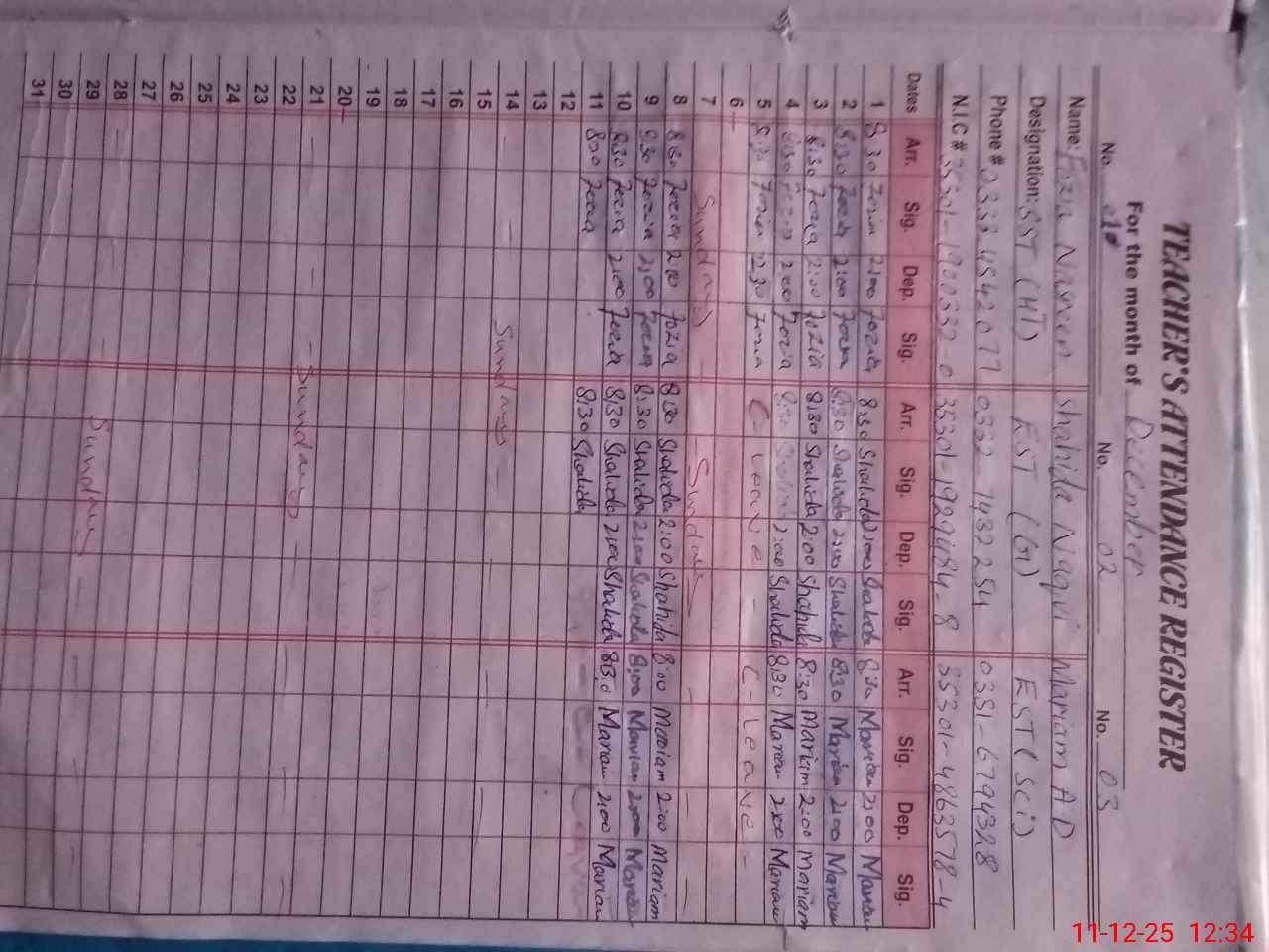 | CNIC | Full Name | Designation | R/C | Absence During Last Calender Month |