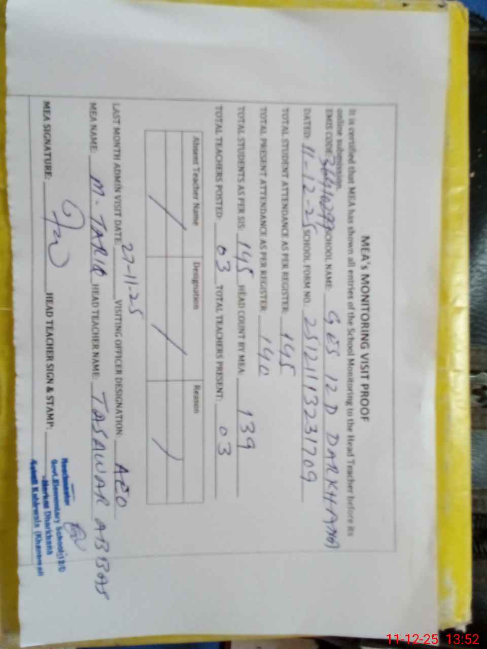 | Attendance Register | Head Teacher | MEA with School | Visit Proof |