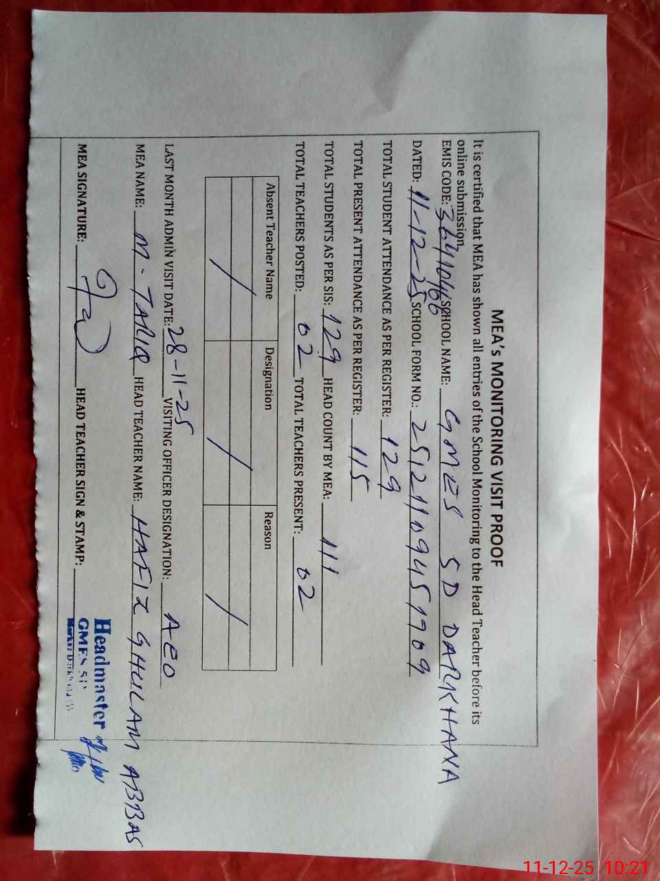 | Attendance Register | Head Teacher | MEA with School | Visit Proof |