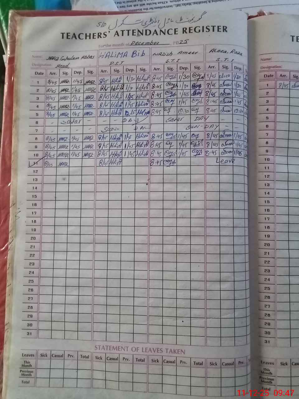 | Leave | Duty | Absent | Maternity | Medical | Ex- Pak |