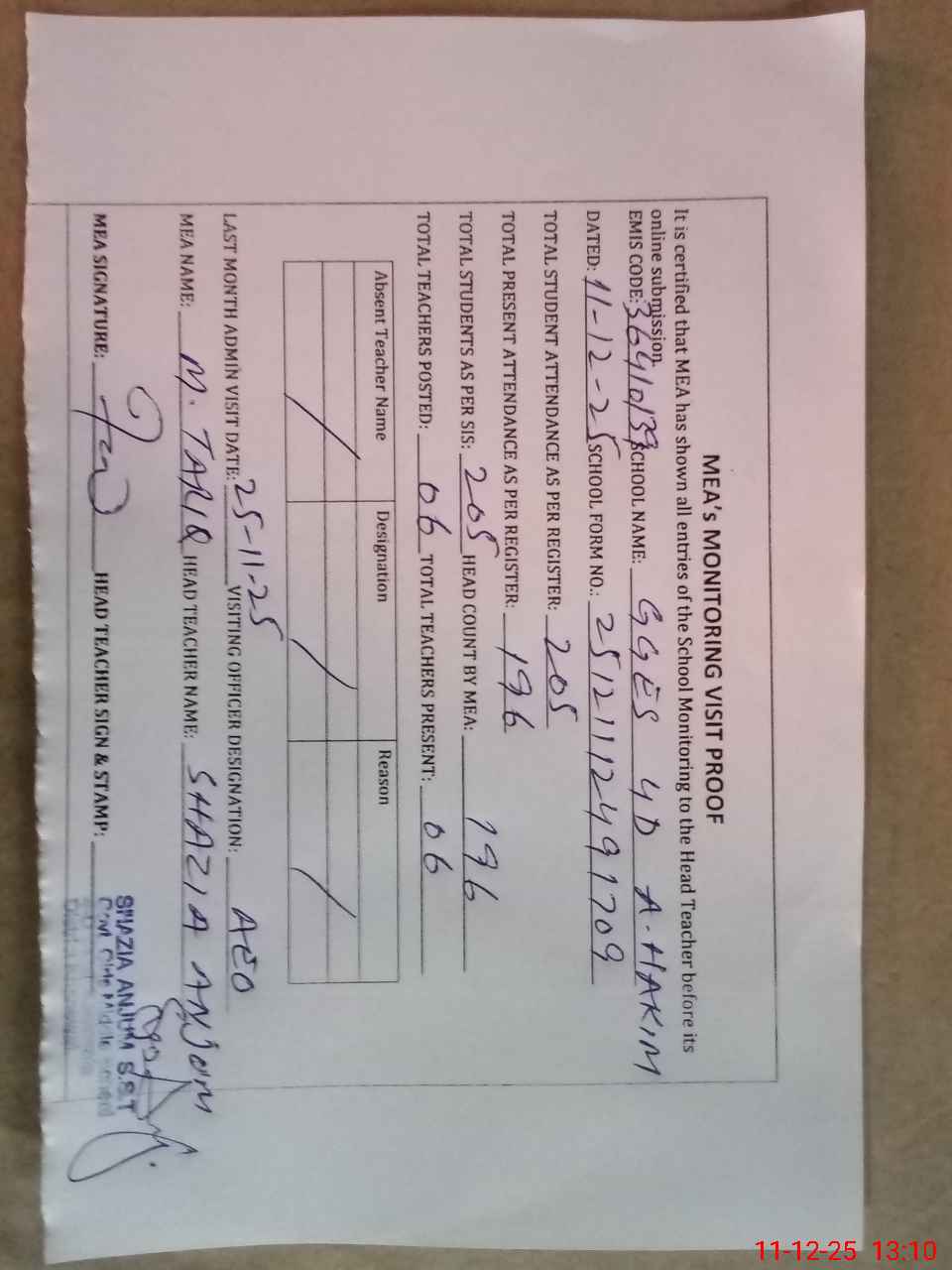 | EMIS Code: 36410139 | Name of School: GGES 4/D, ABDUL HAKIM | |||