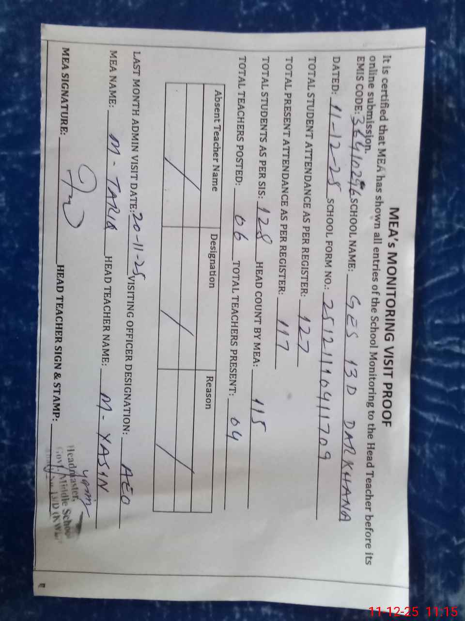 | EMIS Code: 36410296 | Name of School: GES 13/D, P/O DARKHANA, ABDUL HAKIM | |||