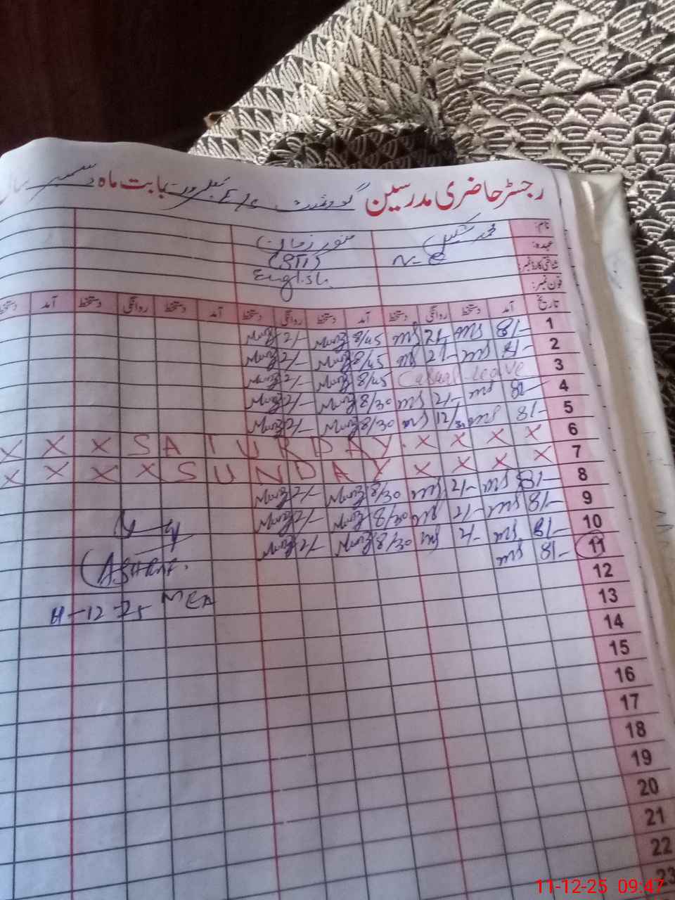 | CNIC | Full Name | Designation | R/C | Absence During Last Calender Month |