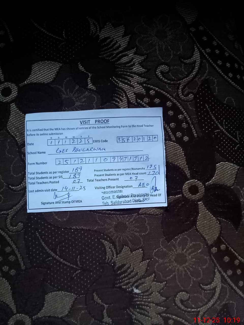 | Certified that this School was Inspected by the Undersigned MEA/DMO Today and the Information Stated Above is as Per Record. | |||||
