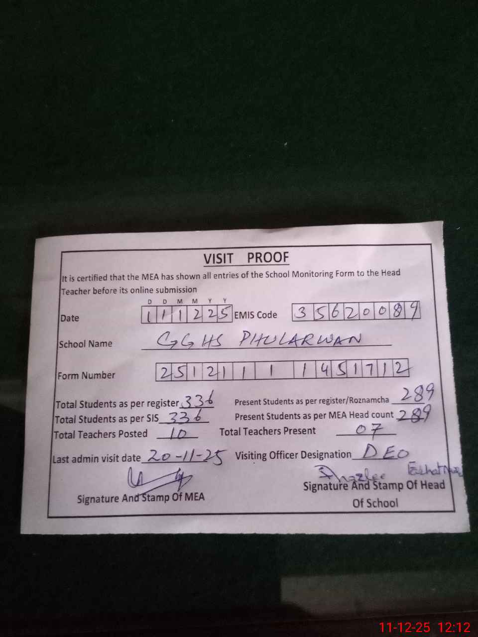 | Attendance Register | Head Teacher | MEA with School | Visit Proof |