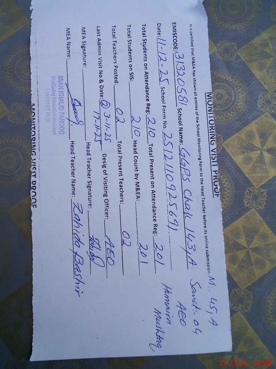 | EMIS Code: 31320581 | Name of School: GGPS CHAK NO.143/A | |||