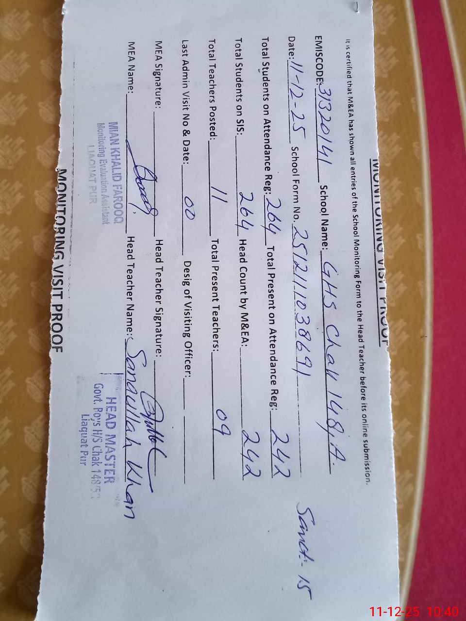 | Monitoring Date: 11-12-2025 | Start Time: 11-12-2025 09:45 AM | End Time: 11-12-2025 10:40 AM | Name of MEA: Kh**** Fa**** | |