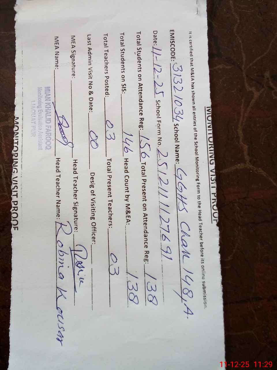 | EMIS Code: 31321034 | Name of School: GGHS Chak No 148/5-R | |||