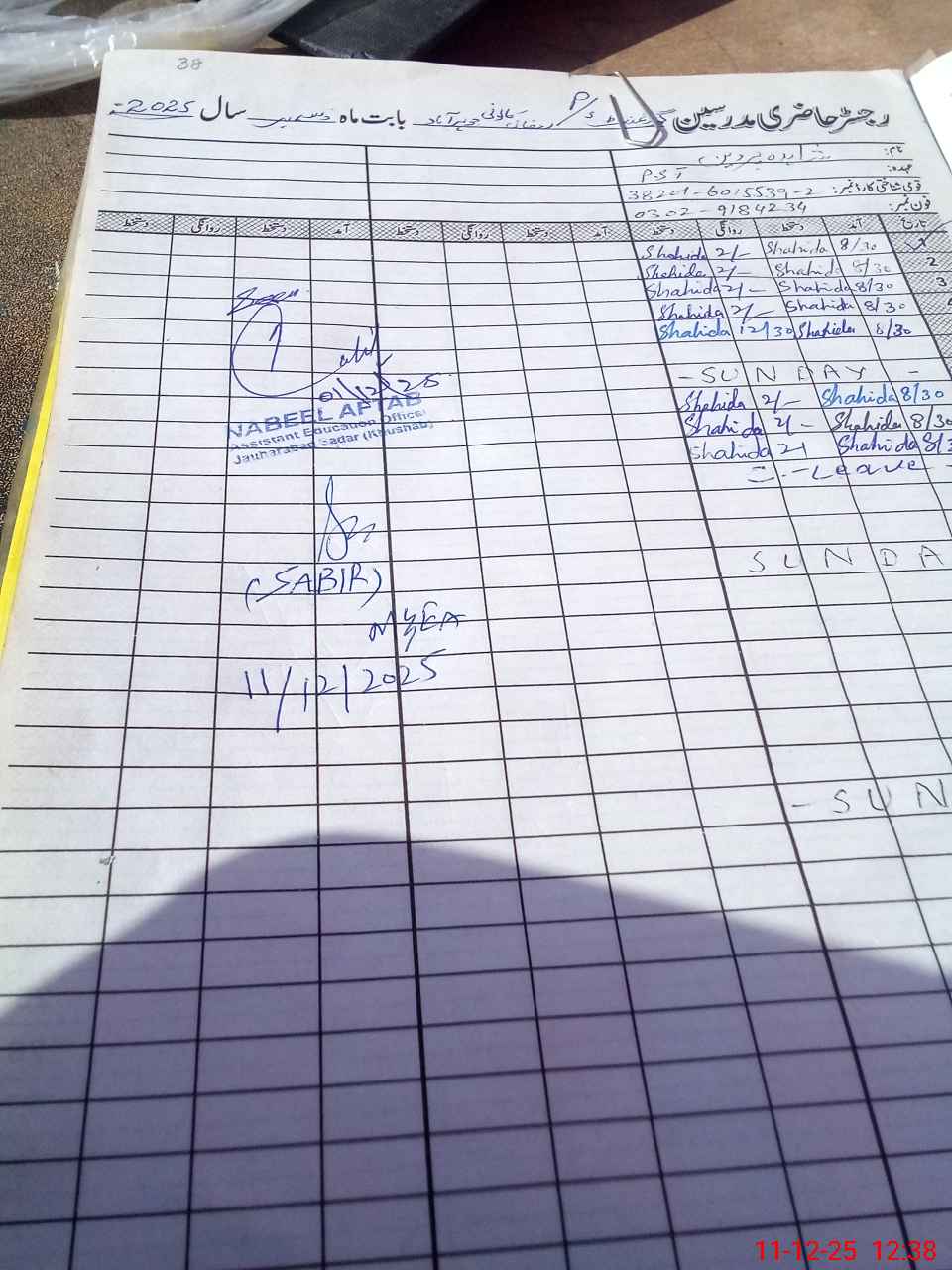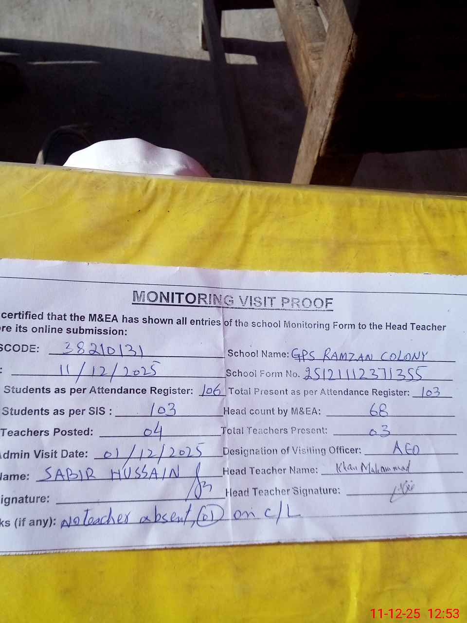 | Remarks (Use Separate Page if Required): no teacher absent total students on register 106 total students on SiS 103 present students are 68 last admin visit by AEO 01 Dec 2025 | |||||