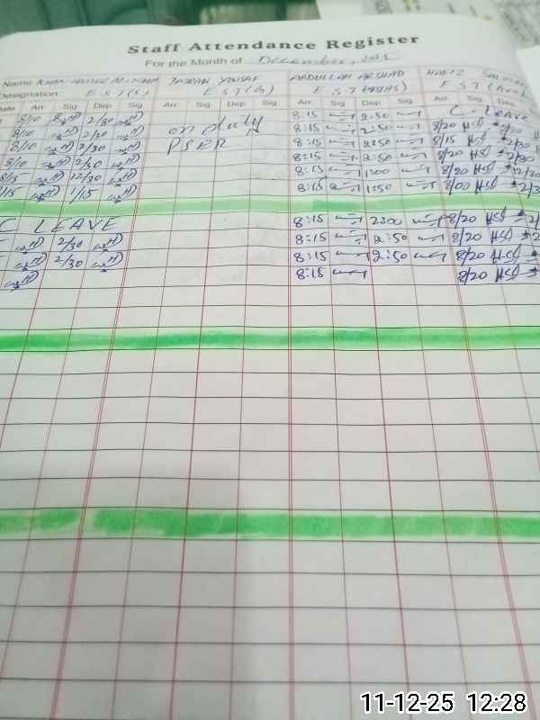 | CNIC | Full Name | Designation | R/C | Absence During Last Calender Month |
