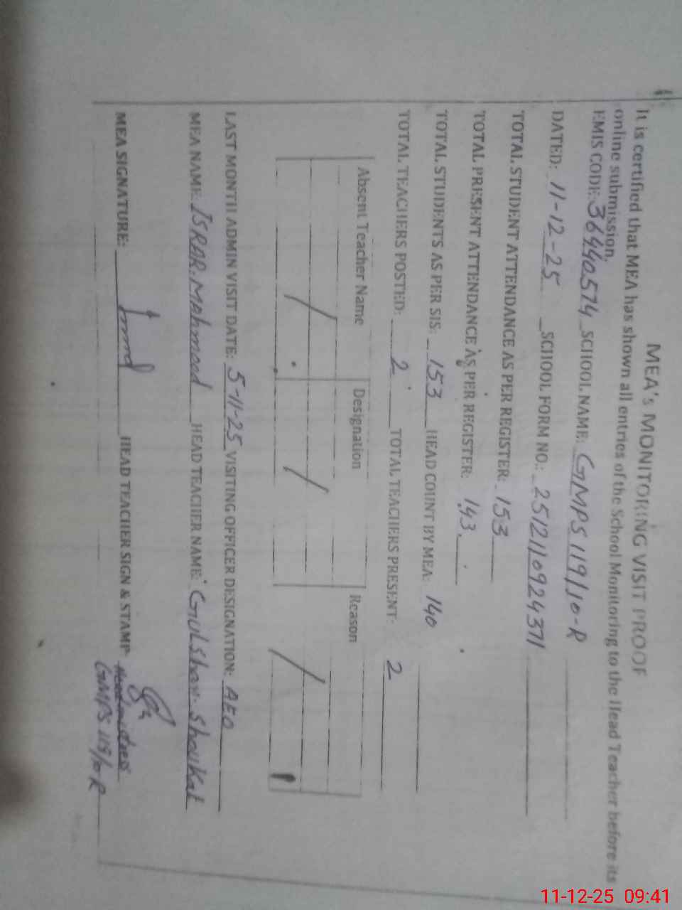 | Attendance Register | Head Teacher | MEA with School | Visit Proof |