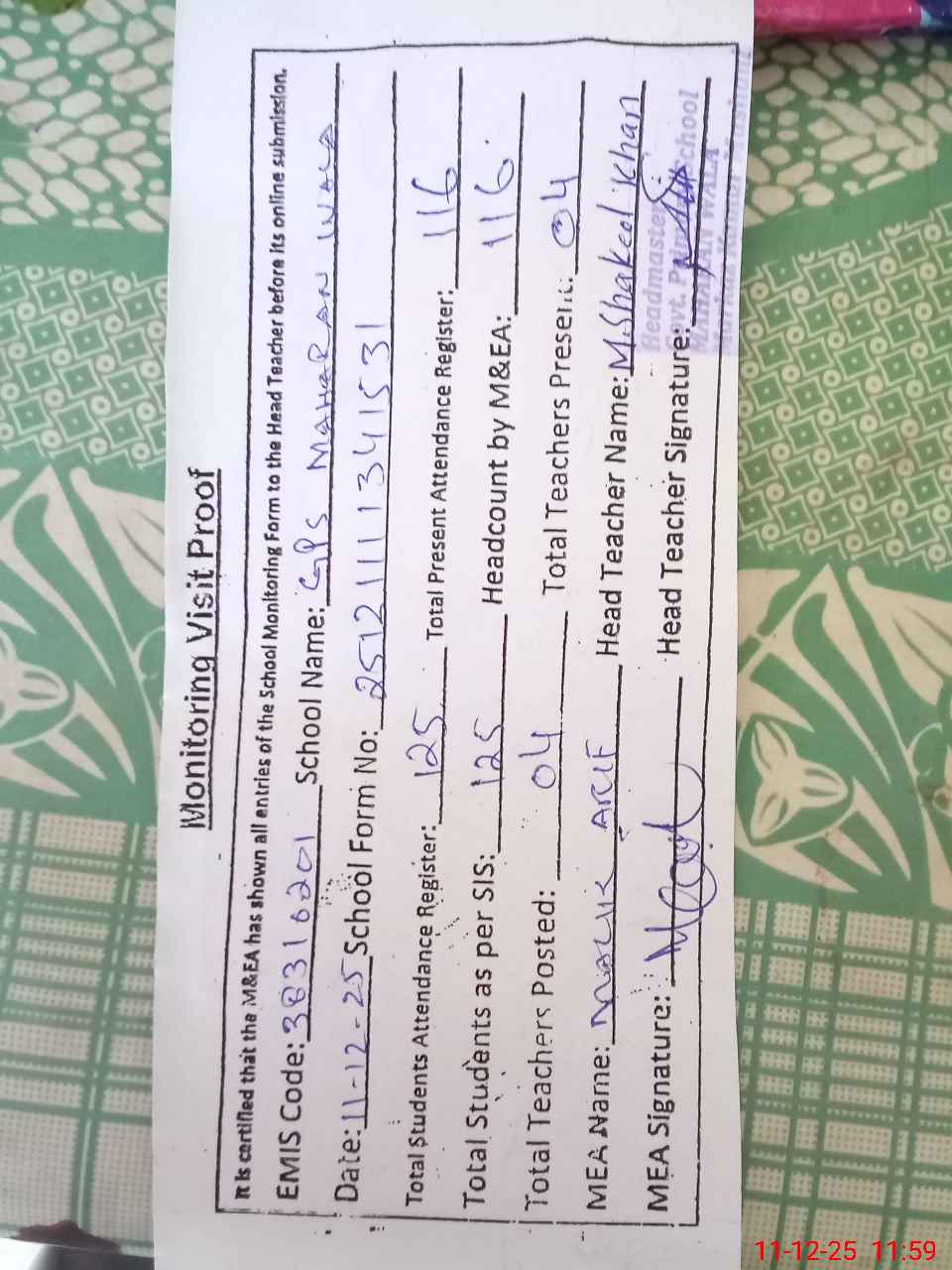 | Attendance Register | Head Teacher | MEA with School | Visit Proof |