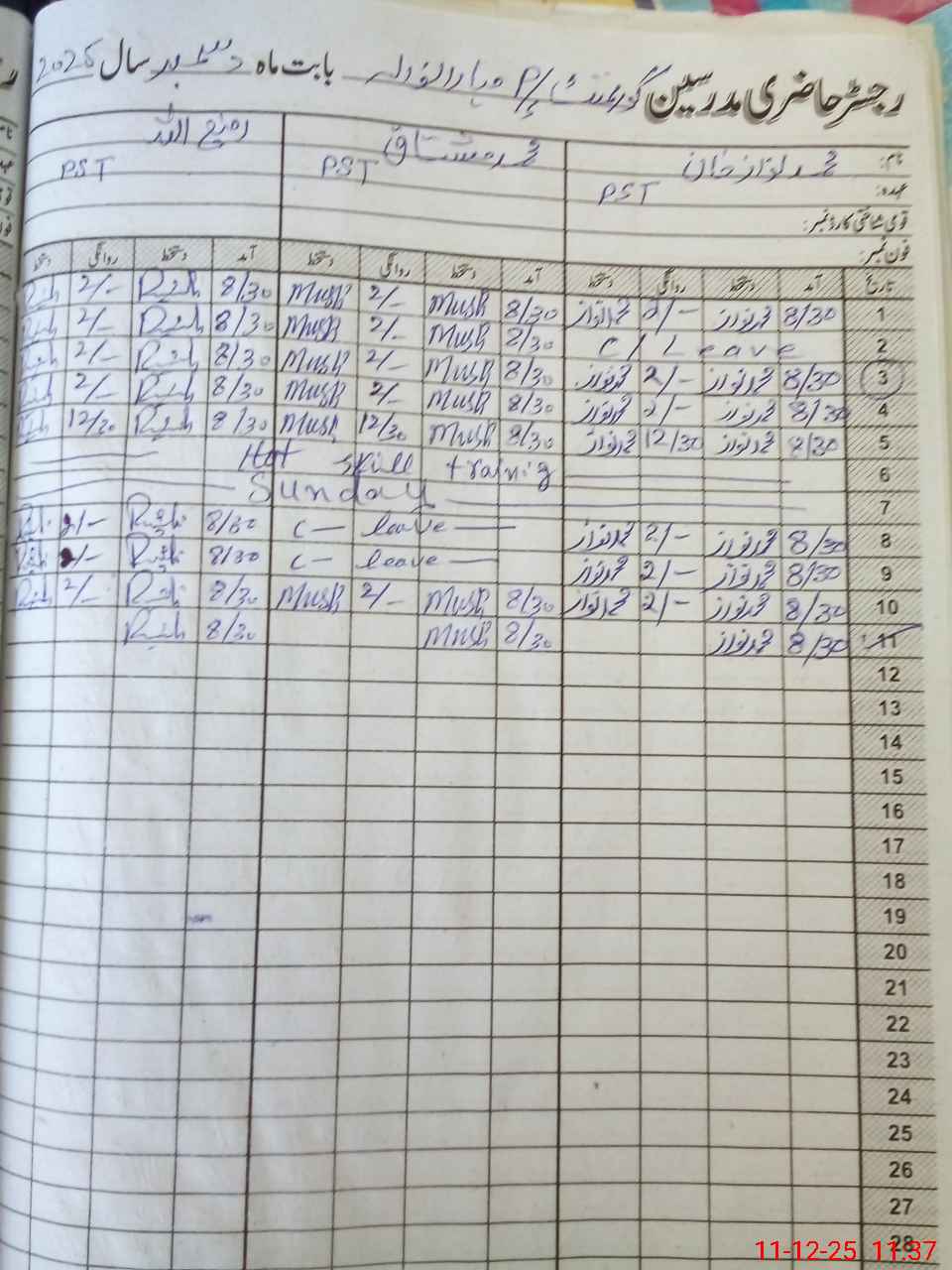| CNIC | Full Name | Designation | R/C | Absence During Last Calender Month |