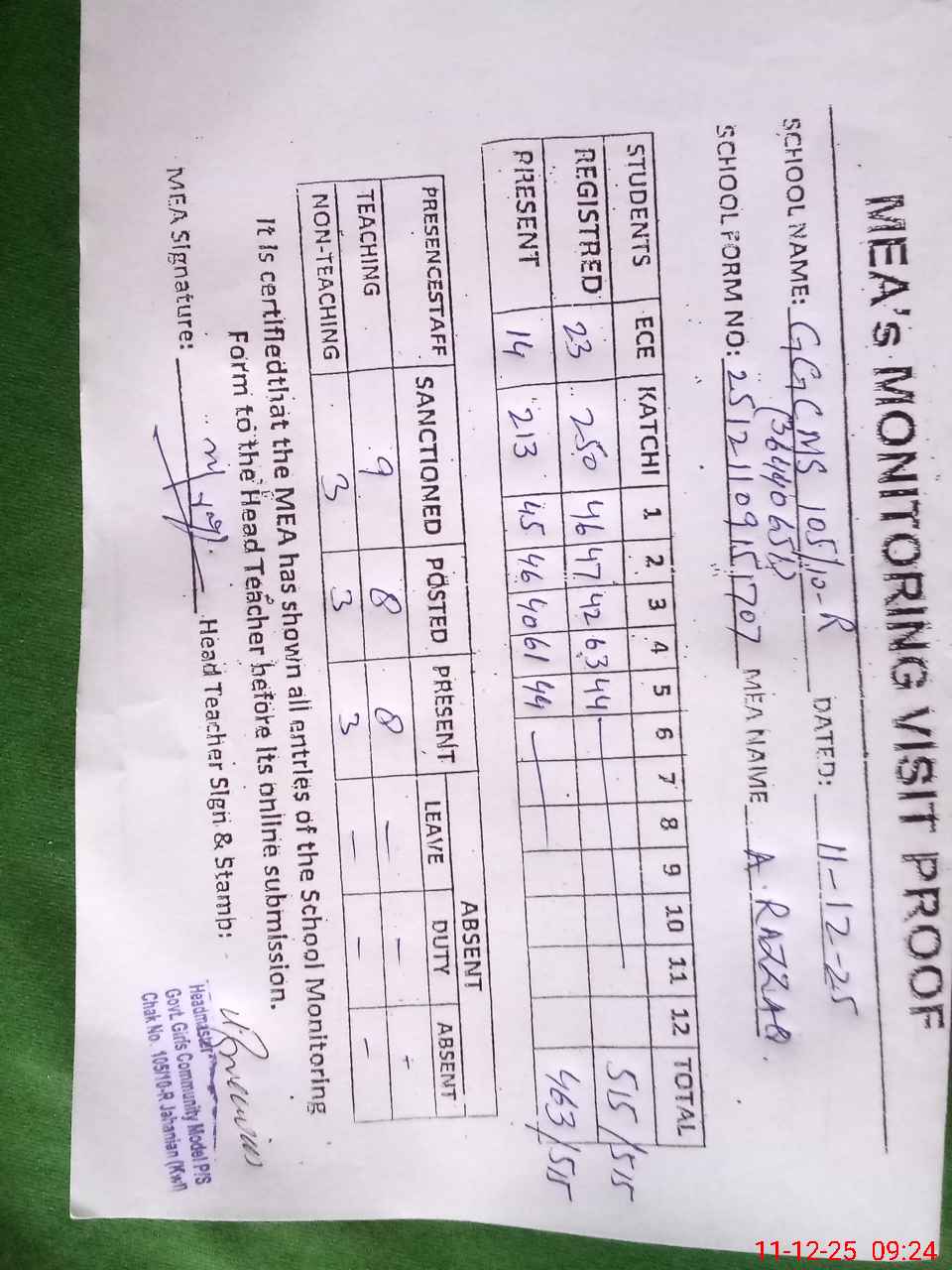 | Monitoring Date: 11-12-2025 | Start Time: 11-12-2025 09:05 AM | End Time: 11-12-2025 09:29 AM | Name of MEA: AB**** RA**** | |