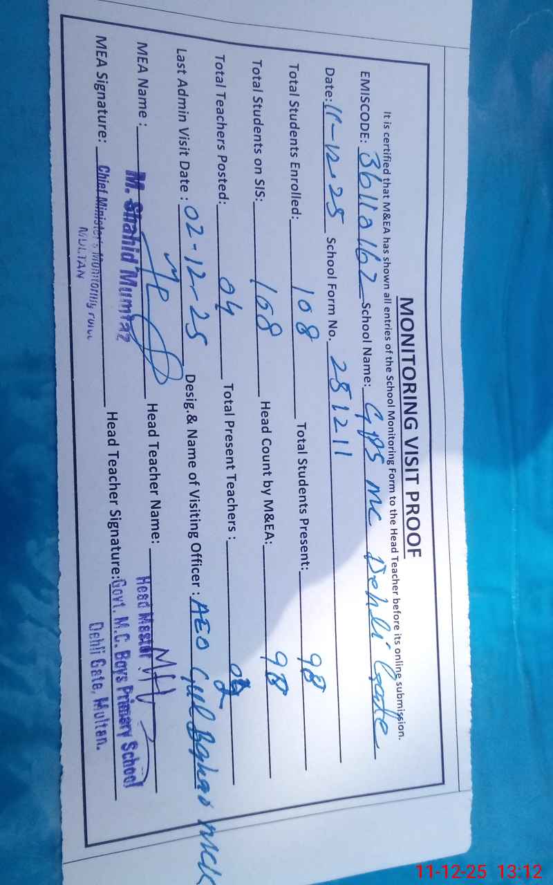 | EMIS Code: 36110162 | Name of School: GPS MC DEHLI GATE MULTAN | |||