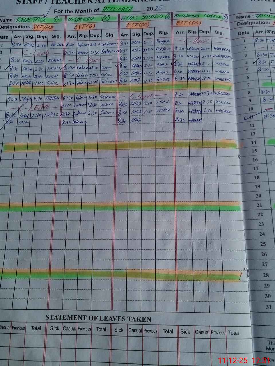 | CNIC | Full Name | Designation | R/C | Absence During Last Calender Month |