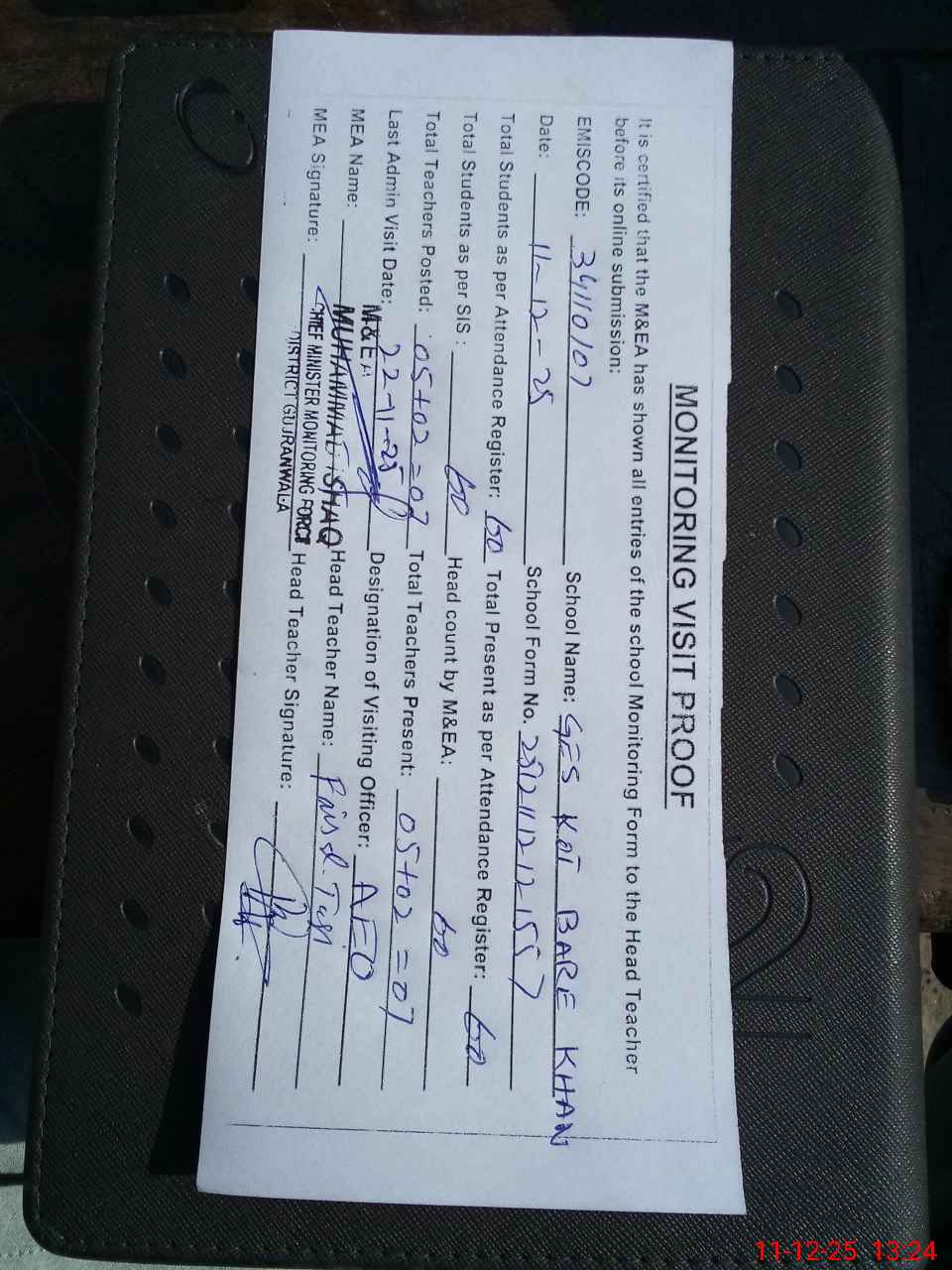 | Attendance Register | Head Teacher | MEA with School | Visit Proof |